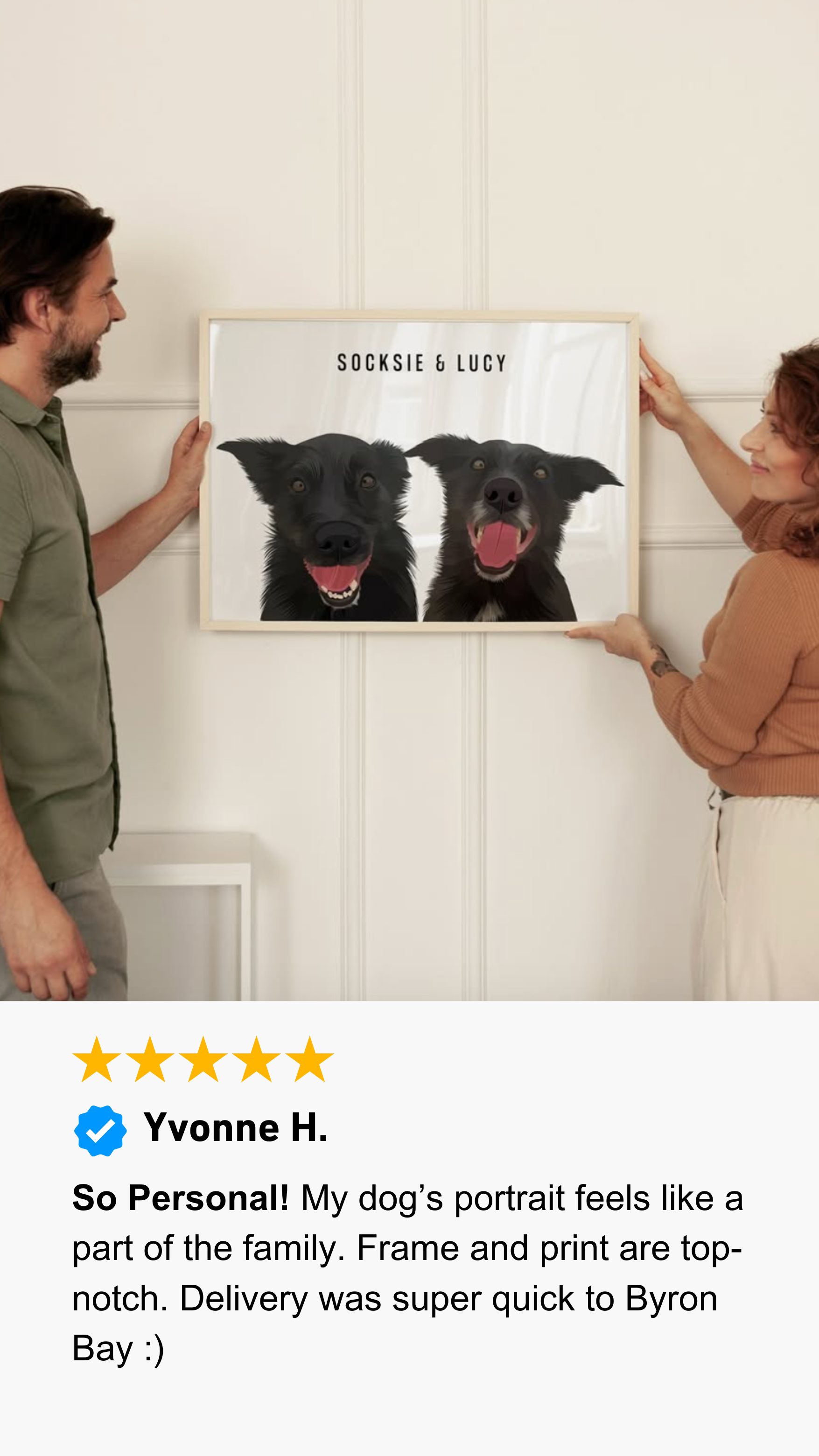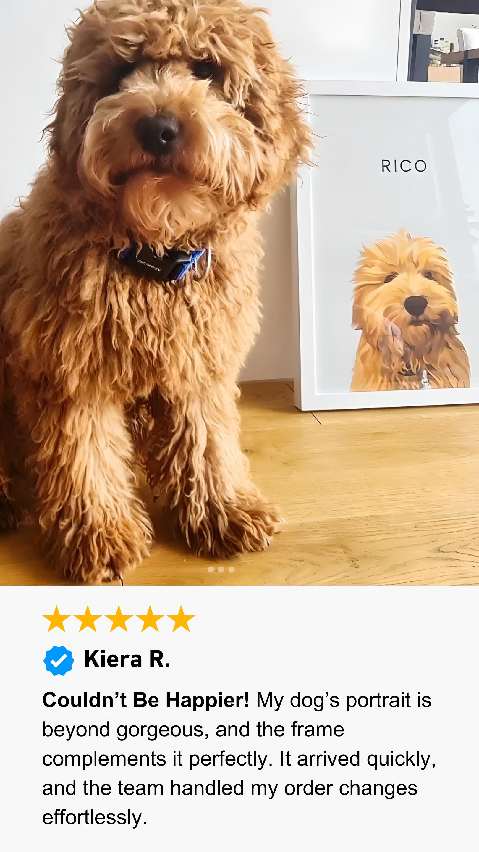 Add your pup's name, customize the portrait style, and choose your frame & size.